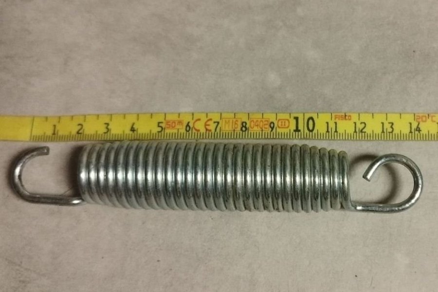 En dragfjäder med öglor i båda ändar. Längd ca 14 cm.
