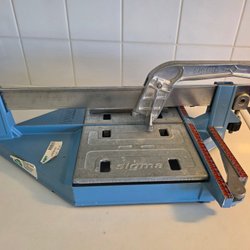 Kakelskärare med en röd handtag och en grå arbetsyta. Den har en inbyggd sågklinga och en strömbrytare med grön och röd knapp. En elkabel med stickkontakt finns undertill.