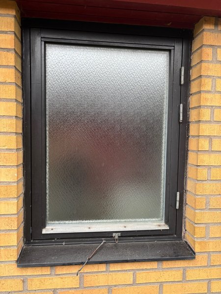Fönster med frostat glas och svart ram. Fönstret har en enkel öppningsmekanism. 890x1200