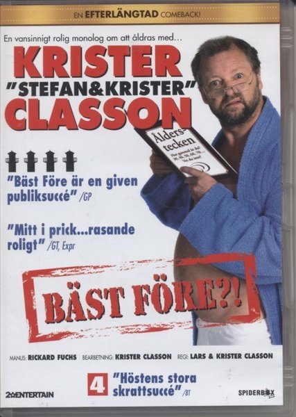 En vansinnigt rolig monolog om att åldras med Krister Classon från "Stefan & Krister". "Bäst Före är en given publiksuccé" /GP. "Mitt i prick...rasande roligt" /GT, Expr. "Höstens stora skrattsuccé" /BT. Manus av Rickard Fuchs. Bearbetning av Krister Classon. Regi av Lars & Krister Classon. 104 min. (2006) svenska. Ej textad.