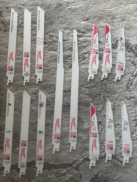 Blandade Milwaukee sågblad för tigersåg. Inkluderar ”The Ax” för trä med spik och ”Multi-Material” blad.