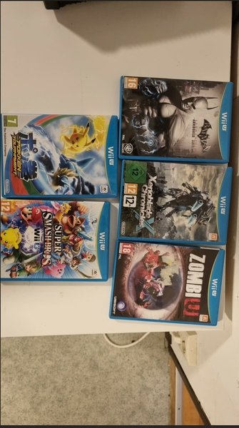 Säljer ett paket med fem Wii U-spel. Paketet innehåller Batman: Arkham City Armored Edition, Xenoblade Chronicles X, ZombiU, Pokkén Tournament och Super Smash Bros. for Wii U.