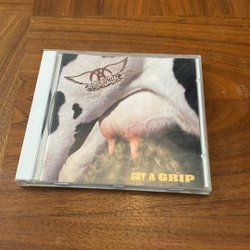 CD-album med "Get A Grip" av Aerosmith. Utgiven av Geffen Records. Katalognummer: GED24444. Innehåller 15 låtar, inklusive "Eat The Rich", "Livin' On The Edge" och "Crazy". Producerad av Bruce Fairbairn och mixad av Brendan O'Brien.