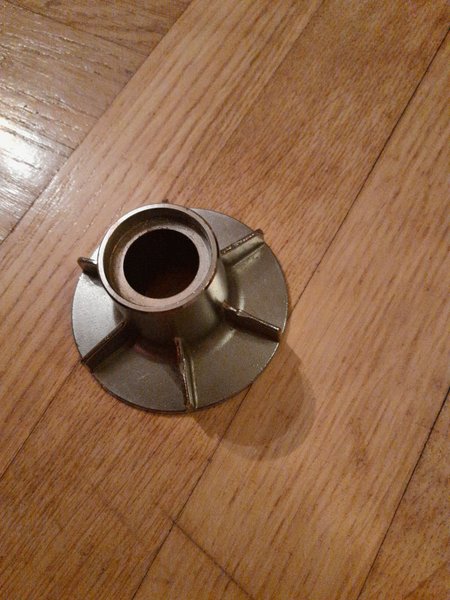Ett metallfäste med en rund bas och en cylindrisk upphöjning i mitten. Fästet har fyra förstärkningar som strålar ut från den cylindriska delen till basen. Volvo Penta-del tror jag.