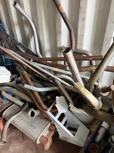Parti med olika avgassystem och ljuddämpare. Innehåller delar från bland annat Renault och Cheva. Kommer från äldre lager. Nya.