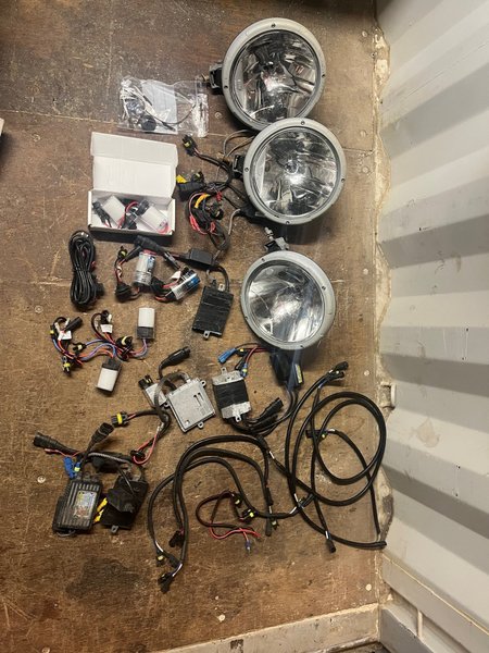 3 st extraljus 9” (220mm) med xenonkonvertering. Medföljer diverse saker som ballaster, nya lampor och kablar.
