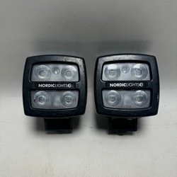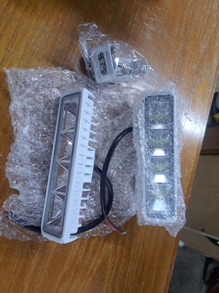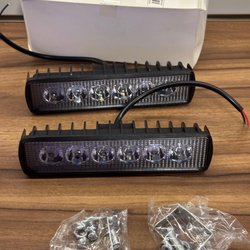 Två LED-arbetsbelysningar med fästen. Ljusen har en rektangulär form och är förpackade i bubbelplast.