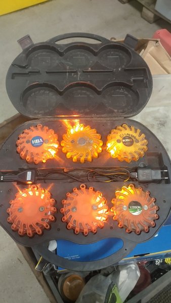 Set med 5 st uppladdningsbara och 1st med utbytbart CR123a batteri varningslampor. Lamporna har magnetfäste, 16 ljusdioder och 9 olika ljusfunktioner: 2 olika roterande ljus, fast sken max, fast sken ekonomi, 2 LED fast sken, 4 LED fast sken, enkelt blixtljus, alternerande blixtljus, SOS. Levereras i plastväska 230V- och 12V-laddare. Samtliga lampor kan laddas samtidigt via uttag i väskan.