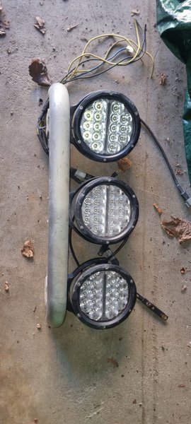 LED-extraljusramp med tre runda lampor. Varje lampa har flera LED-dioder. Rampen är monterad på en metallstång och har anslutningskablar.