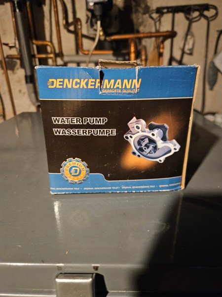 DENCKERMANN vattenpump. "Geprüfte Qualität" (testad kvalitet) är tryckt på förpackningen. Texten "Original Denckermann Teile" (Original Denckermann delar) finns också på förpackningen.