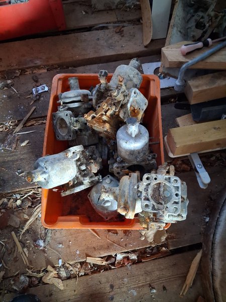 Ett parti med förgasare. Dessa delar kan vara av intresse för den som söker reservdelar eller för renoveringsprojekt. Säljes i befintligt skick.