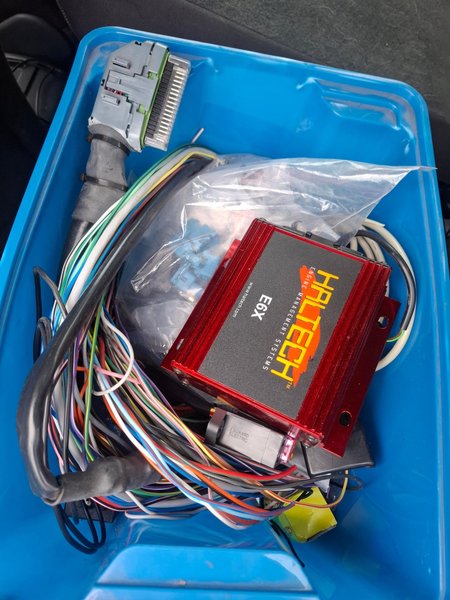 Haltech E6X motorstyrsystem med tillhörande kabelhärva. Systemet är designat för motorstyrning och levereras med en komplett kabeluppsättning finns kontakter diverse givare och triggerskiva