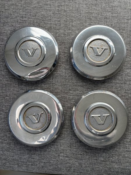 Volvo navkapslar i kromfärg. Satsen består av fyra navkapslar med Volvo-logotyp i mitten. Den längst ner till vänster på bilden har en buckla (inget veck).