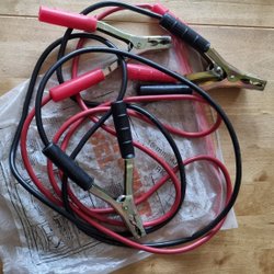 Startkablar i praktisk förvaringsväska. Instruktioner för användning finns tryckt på väskan.
