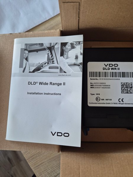VDO DLD Wide Range II med installationsinstruktioner. Serienummer: 181816032209430256859. Modellnummer: A3C01336502. IMEI: 355058075686609. IMSI: 204047146263095. Typ: 1818. Tillverkad av Continental Automotive GmbH, D-78052 Villingen-Schwenningen.