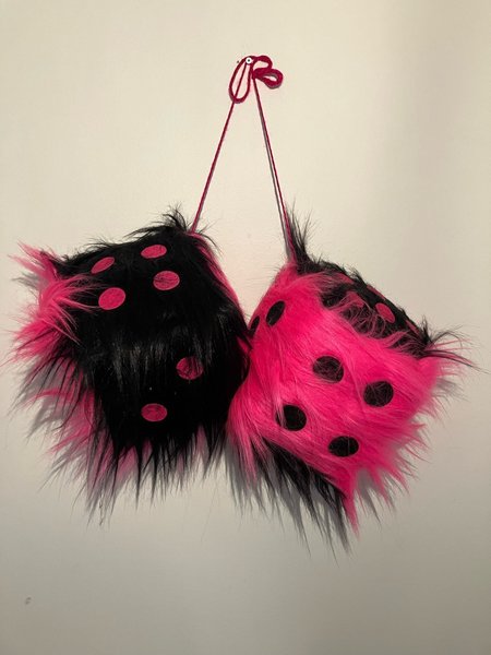 Egentillverkade långhåriga tärningar 12x12 cm, svart/rosa med svarta och rosa prickar.