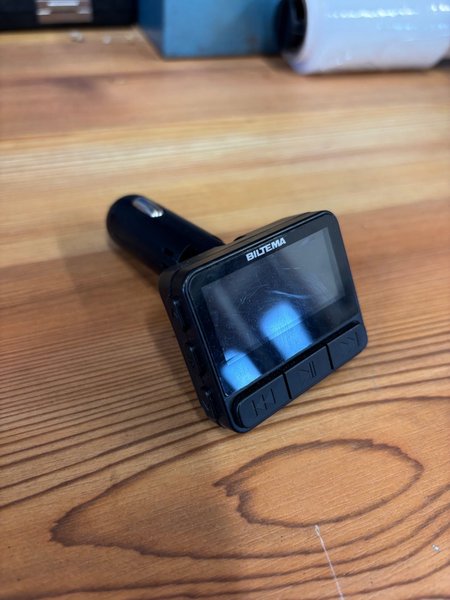 FM-sändare från Biltema för uppspelning av musik i bilen. Ansluts till bilens 12V-uttag. Har knappar för att styra uppspelningen.