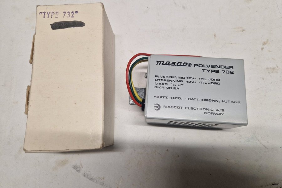 Mascot Polvender Type 732. Inspenning 12V = +Till Jord. Utspenning 12V = -Till Jord. Maks. 1A ut. Säkring 2A. +Batt: Röd, -Batt: Grönn, +Ut:Gul. Mascot Electronic A/S Norway.