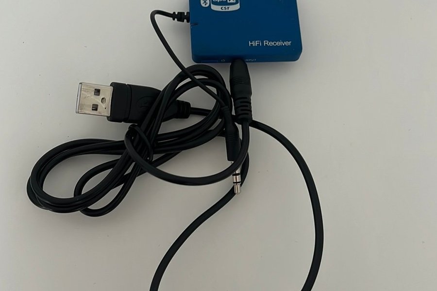 Bluetooth-adapter för att strömma ljud trådlöst till ditt HiFi-system. Utrustad med aptX-teknik för förbättrad ljudkvalitet. Ansluts via USB för ström och har en 3,5 mm ljudutgång.