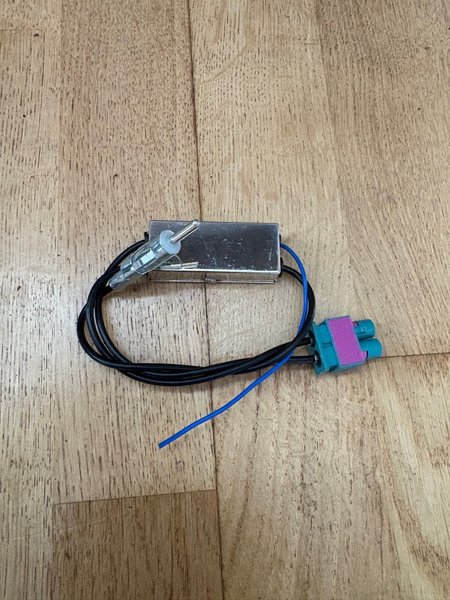 Antennadapter för bilstereo. Adaptern har en metallkapsling och kablar med en blå och en svart isolering. Den har en anslutning som ser ut som en standard antennkontakt och en annan anslutning med två stift i turkos och lila plast.