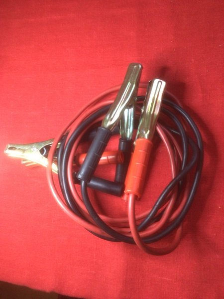 Startkablar för bilbatteri. Kablarna är röda och svarta med klämmor i metall. Area 10mm2, material fintrådig koppar, antal trådar 200st. Längd 2,5 m, klämmor 120 Amp.