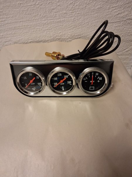 Panel med 52mm oljetrycksmätare, tempmätare och ampmätare. Mekaniska mätare med givare och monteringsdetaljer. Universal som passar de flesta bilar.