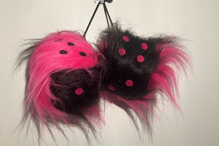 Egentillverkade långhåriga tärningar 5x5 cm, svart/rosa med svarta och rosa prickar.