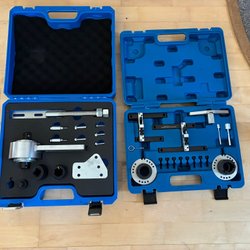 Kamremsverktyg för bilreparationer. Verktygssatsen innehåller olika delar för att underlätta byte av kamrem.