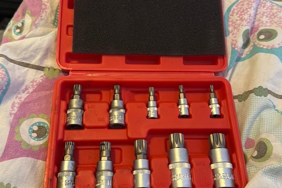 Bitsats med XZN M-profil bits i olika storlekar. Bitsen är förvarade i en röd plastlåda.