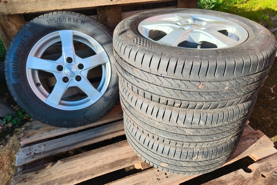 Fina sommardäck på aluminiumfälg som rullat 500mil. 14". 100/5 delning med navring.
