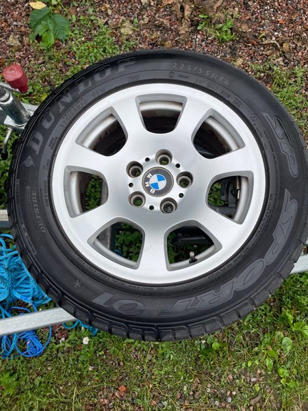 Fälgarna är till BMW och ej kantstötta. Däcken är Dunlop 225/55 R 16. Det finns små sprickor i däcken men enligt däckfirman saknar det betydelse för säkerheten. Det är väldigt mycket kvar av mönstret. Pris är 500 kr för varje fälg, däcken utan kostnad, gratis.