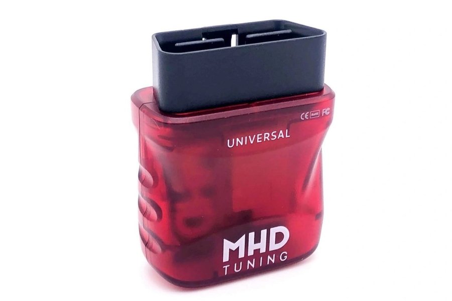 MHD Tuning Universal OBD-adapter för biloptimering. Adaptern är röd och har texten "UNIVERSAL" och "MHD TUNING" på sidan. Den är utformad för att anslutas till fordonets OBD-port.