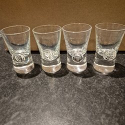9 snaps glas med helga slipning. 9cm hög och rymmer 2 cl. Lite skav på ett glas, se bild.