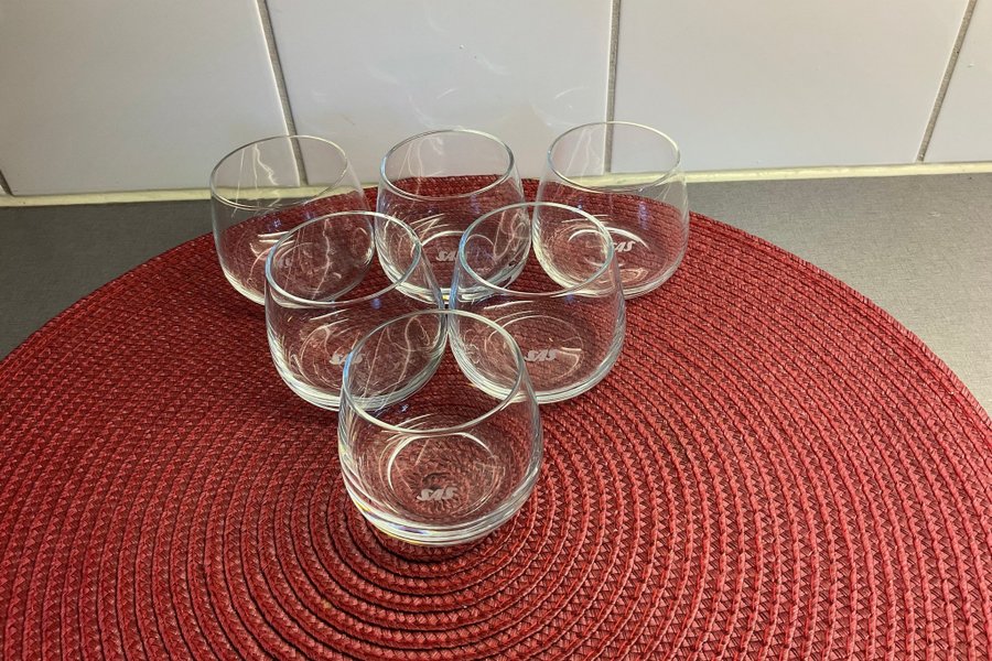 6 st Glas med SAS märkning. Glasen rymmer 10 cl och är 6,3 cm i diameter ”över magen”.
