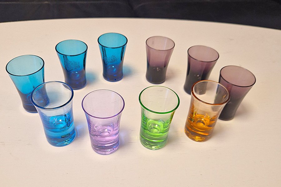 Set med 10 glas i olika färger. Glasen har en avsmalnande form och är i färgerna blå, lila, grön och orange.