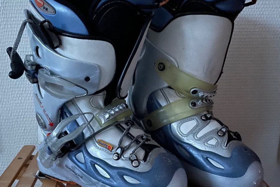 Pjäxor från Rossignol, modell Soft 3. Färgerna är silver, blå och svart. Pjäxorna har Thermo Fit-teknologi. Saknar inre övre spännet på höger fot.