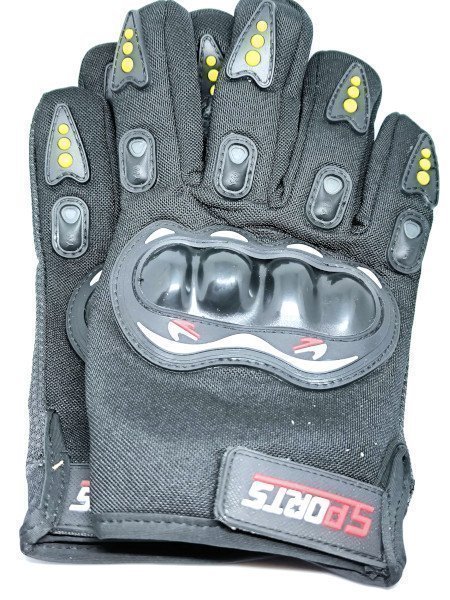 Ett par svarta handskar för motorcykel och sport med förstärkningar och skydd. Perfekt för diverse sporter och aktiviteter.