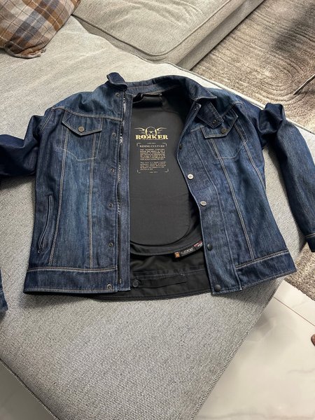 Denimjacka med långa ärmar och krage. Jackan har knäppning framtill och fickor med lock på bröstet. Ärmsluten är också försedda med knappar. En svart insats med texten "ROCKER RIDING CULTURE" syns inuti jackan.