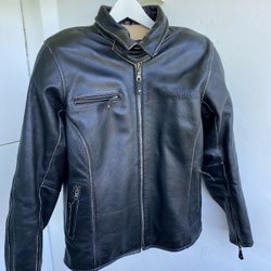 Retro mc-ställ i två delar i storlek 54. Jackan och byxorna kan kopplas ihop. Jackan har en dragkedja framtill och byxorna har en knapp och dragkedja. Både jackan och byxorna har fickor med dragkedja. Jackan har även en justerbar midja med knappar samt förstärkning i ryggen.