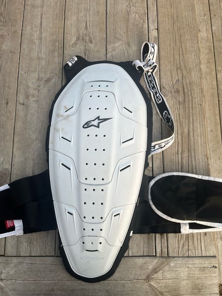 Ryggskydd från Alpinestars i vitt och svart. Skyddet har justerbara axelband och ett midjebälte för säker passform. Alpinestars-logotypen finns på ryggplattan och axelbanden.
