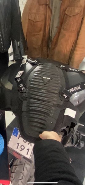 Ryggskydd från Flying Eagle. Justerbara remmar för en anpassad passform, farsan hade den och han är 182cm - Jag 194cm har också lånat utan problem. Kortare än 170 skulle jag inte rekommendera att köpa