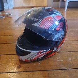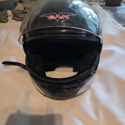 Säljer en svart motorcykelhjälm. Perfekt för dig som behöver en säker och bekväm hjälm för dina motorcykeläventyr.