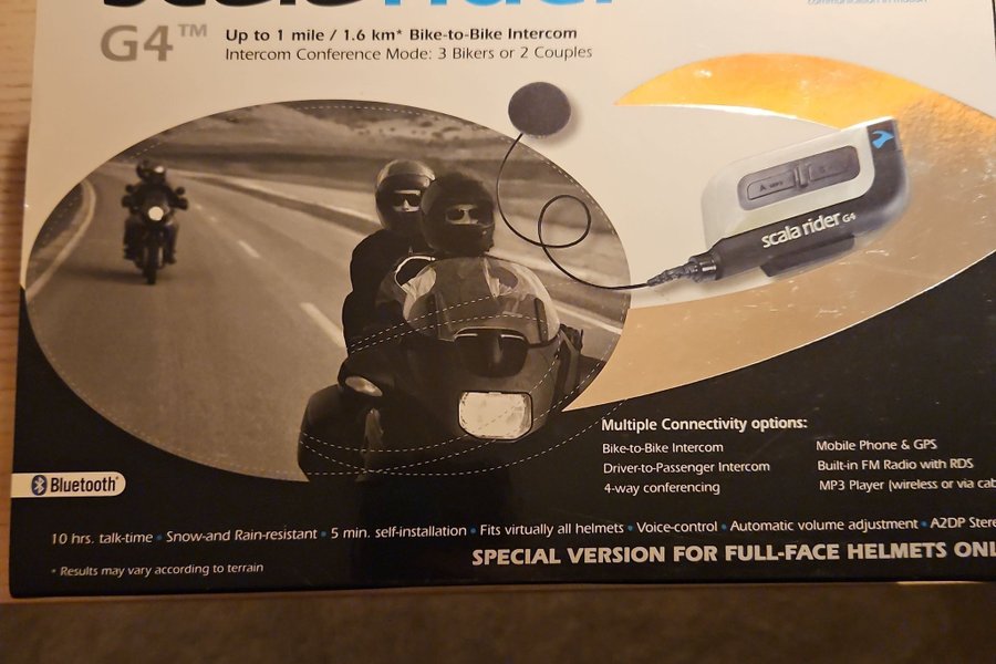 Scala Rider G4, upp till 1,6 km Bike-to-Bike intercom. Intercom konferensläge: 3 motorcyklister eller 2 par. Flera anslutningsalternativ: Bike-to-Bike Intercom, Driver-to-Passenger Intercom, 4-vägs konferens, mobiltelefon och GPS, inbyggd FM-radio med RDS, MP3-spelare (trådlös eller via kabel). 10 timmars samtalstid. Snö- och regntålig. 5 minuters självinstallation. Passar praktiskt taget alla hjälmar. Röststyrning. Automatisk volymjustering. A2DP Stereo. Speciell version för helhjälmar.