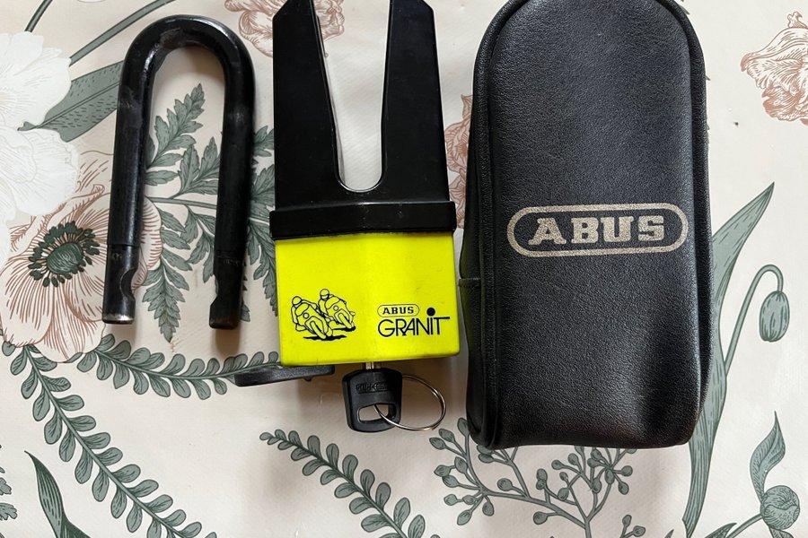 ABUS Granit motorcykellås med tillhörande nyckel och förvaringsväska.