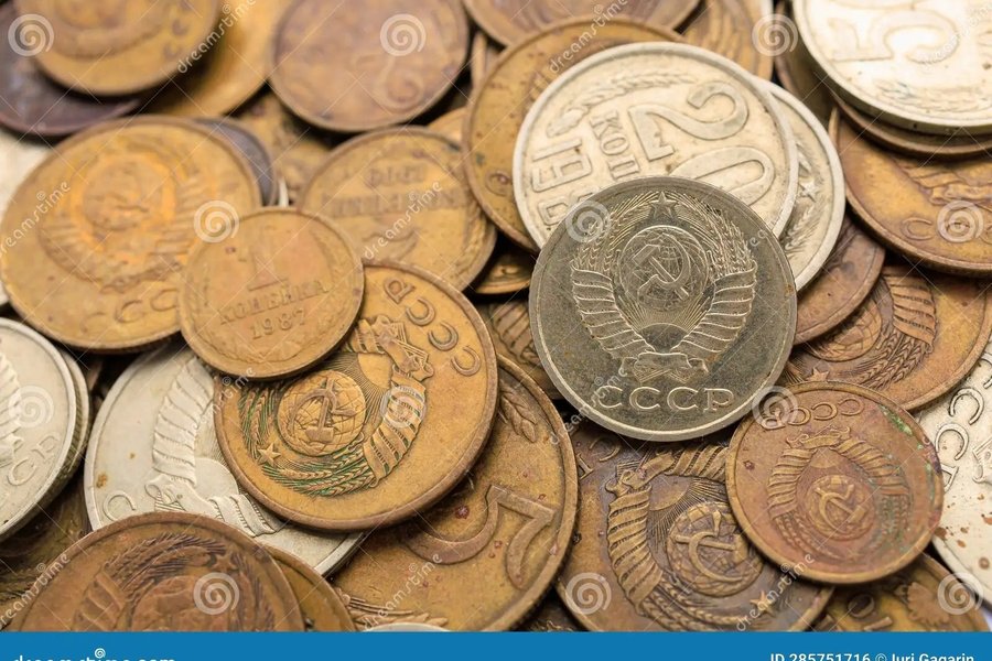 En samling av sovjetiska pengar. Inkluderar mynt 1, 2, 5, 10, 15, 20 kopeks