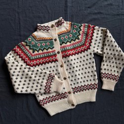Färgglad stickad kofta med lång ärm och fickor fram. Koftan har knappar fram.