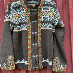 Norsk lusekofta/ullkofta med ett traditionellt mönster i grönt, brunt och orange. Koftan har en benvit basfärg.