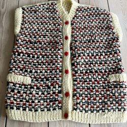 Färgglad stickad väst med knäppning framtill. Västen har ett randigt mönster i olika färger som rött, gult, grönt, blått och svart.