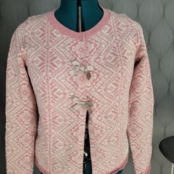 En rosa stickad kofta med ett mönster i vitt. Den har en knappstängning framtill och två fickor på framsidan.