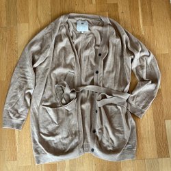 Beige stickad kofta med fickor fram. Koftan har en avslappnad passform och är öppen framtill.